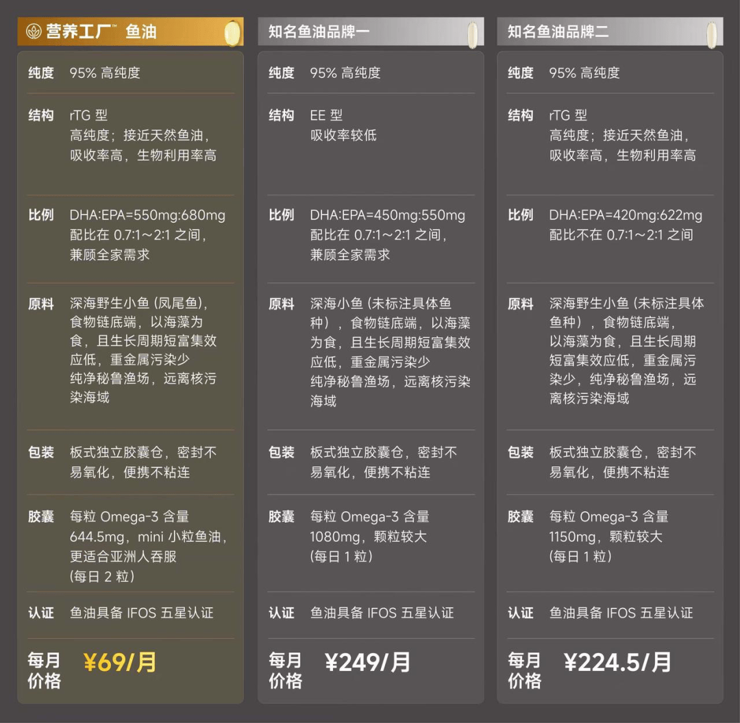 认识到营养工厂这个牌子,是圈内的朋友吐槽,说这家找他们合作的时候,利润低到他们接不了单。刚好这会儿的我因为频繁长时间面对屏幕,我总觉得需要额外关注一下自己的状态。做了一番功课后,我了解到鱼油是很多朋友日常保养的选择,便决定试试营养工厂的这款。吃了一段时间,单从我自己的体验上来说,和我之前尝试过的其他高价产品,感觉上没什么差别。